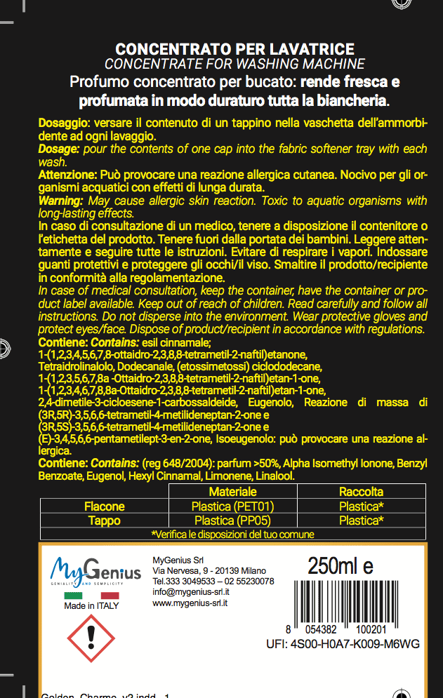 Il nostro concentrato per bucato “Golden Charme” garantisce una sensazione di pulito e freschezza che dura a lungo, avvolgendo la tua biancheria in un abbraccio di fragranza piacevole e persistente.